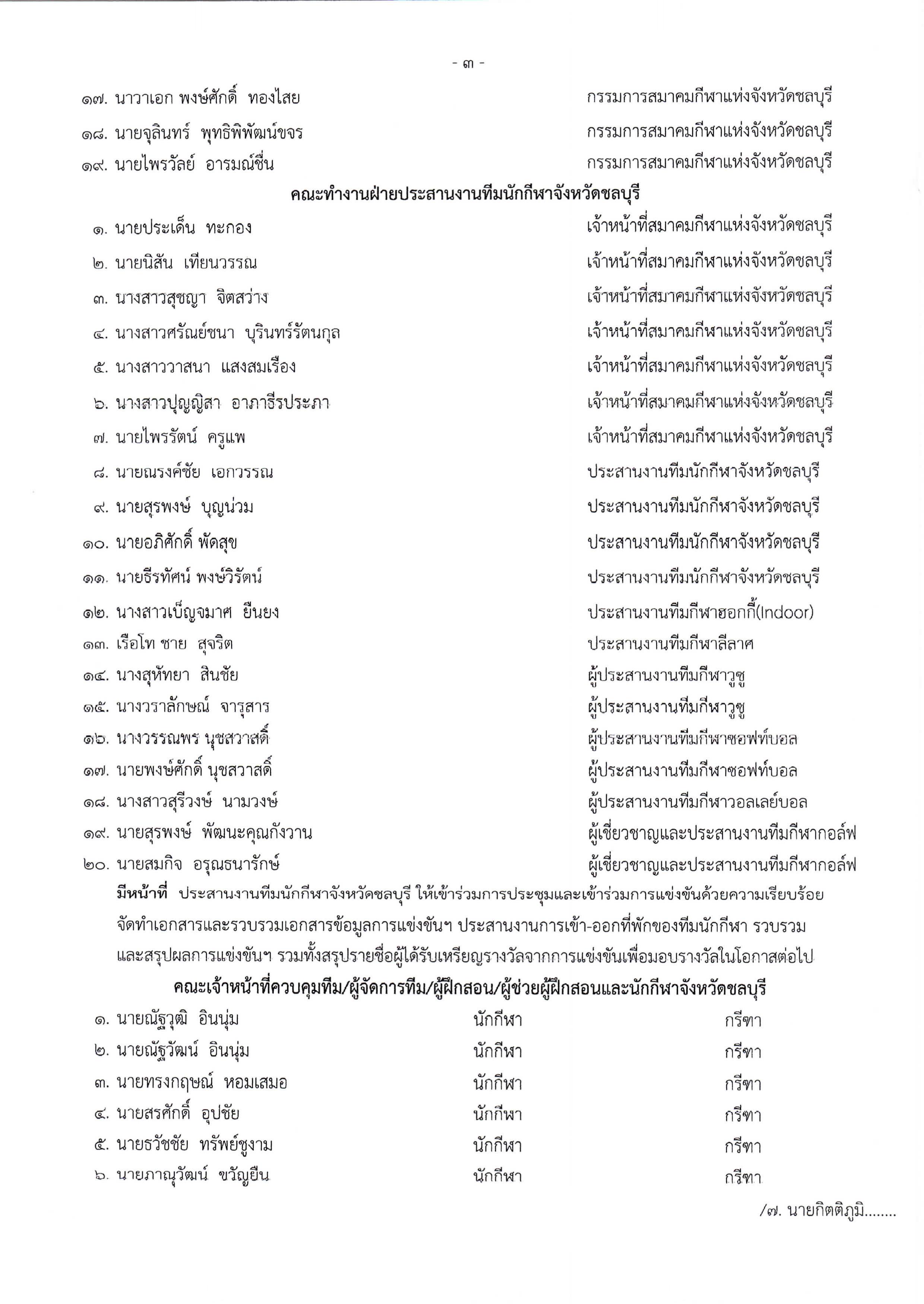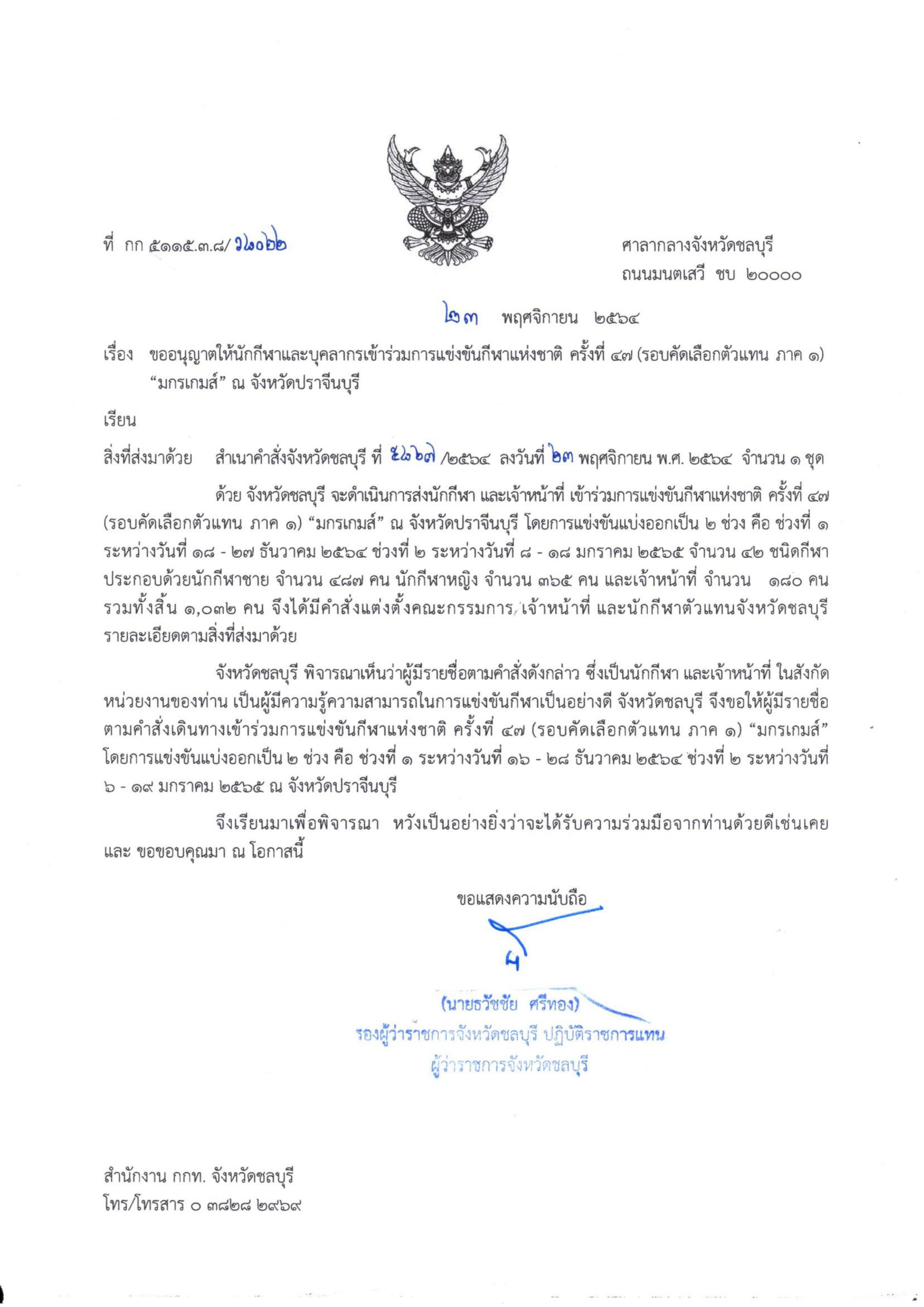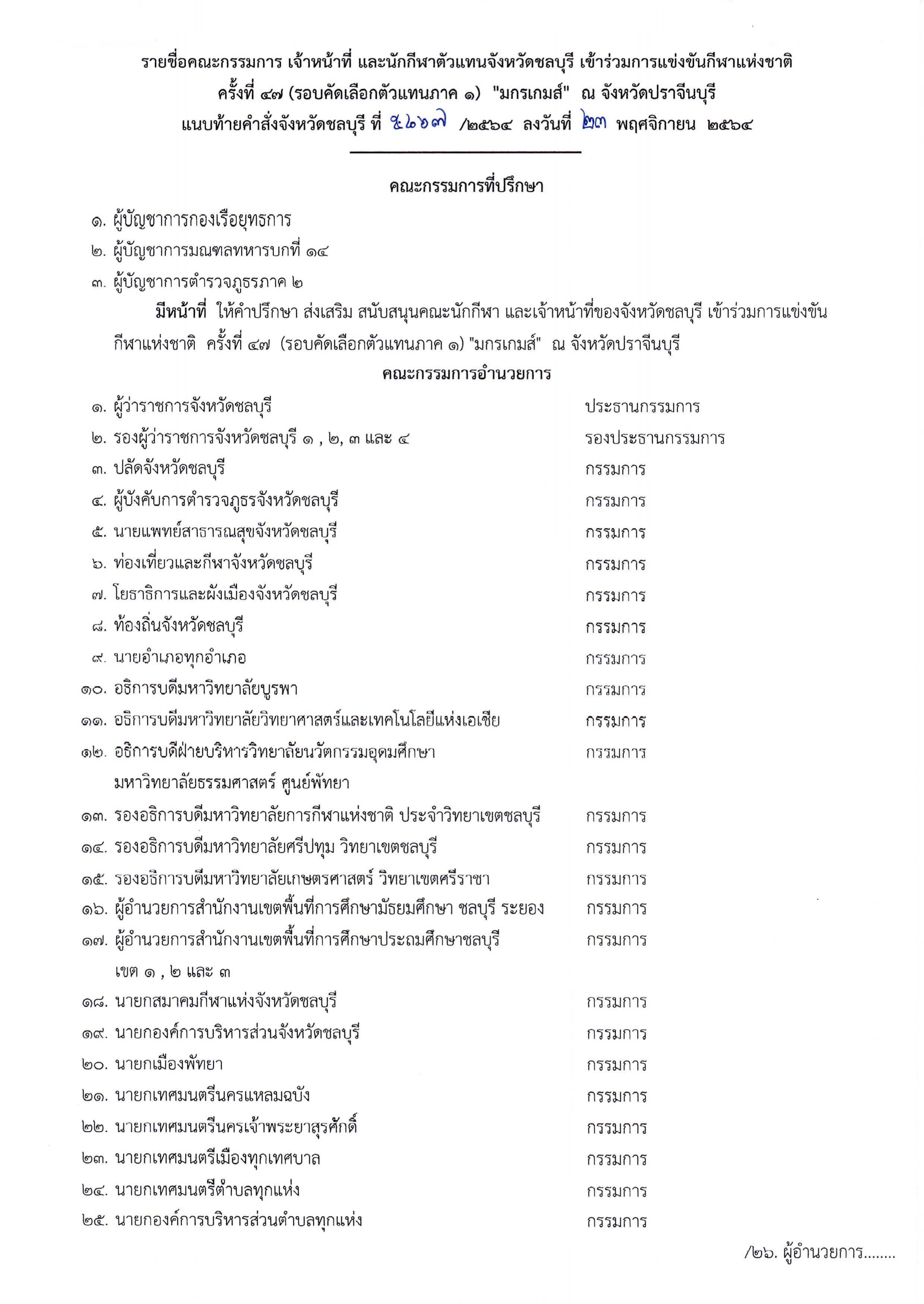 - รายชื่อคณะกรรมการ เจ้าหน้าที่และนักกีฬาตัวแทนจังหวัดชลบุรี เข้าร่วมการแข่งขันกีฬาแห่งชาติ ครั้งที่ 47 (รอบคัดเลือกตัวแทนภาค 1) “มกรเกมส์” ณ จังหวัดปราจีนบุรี