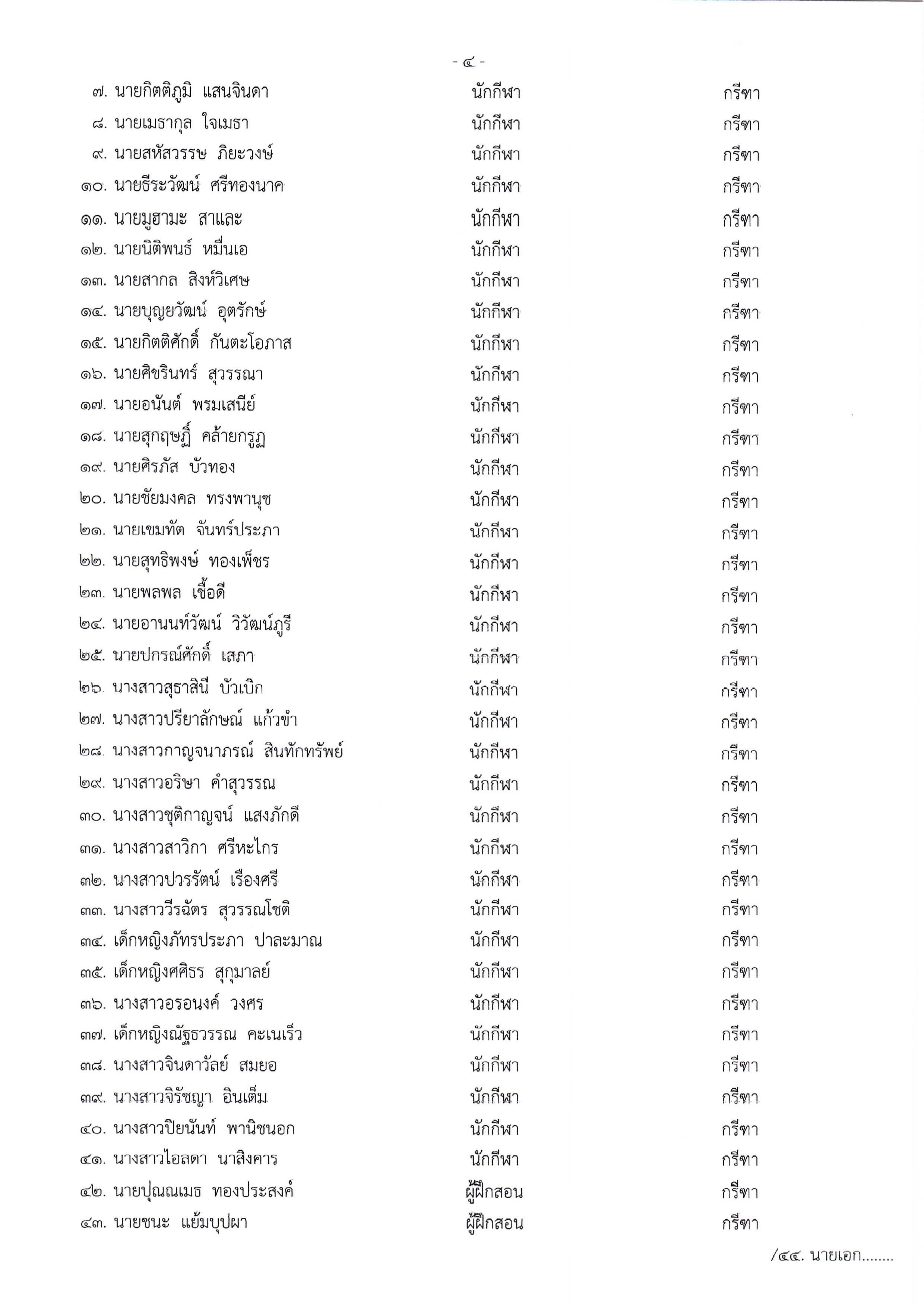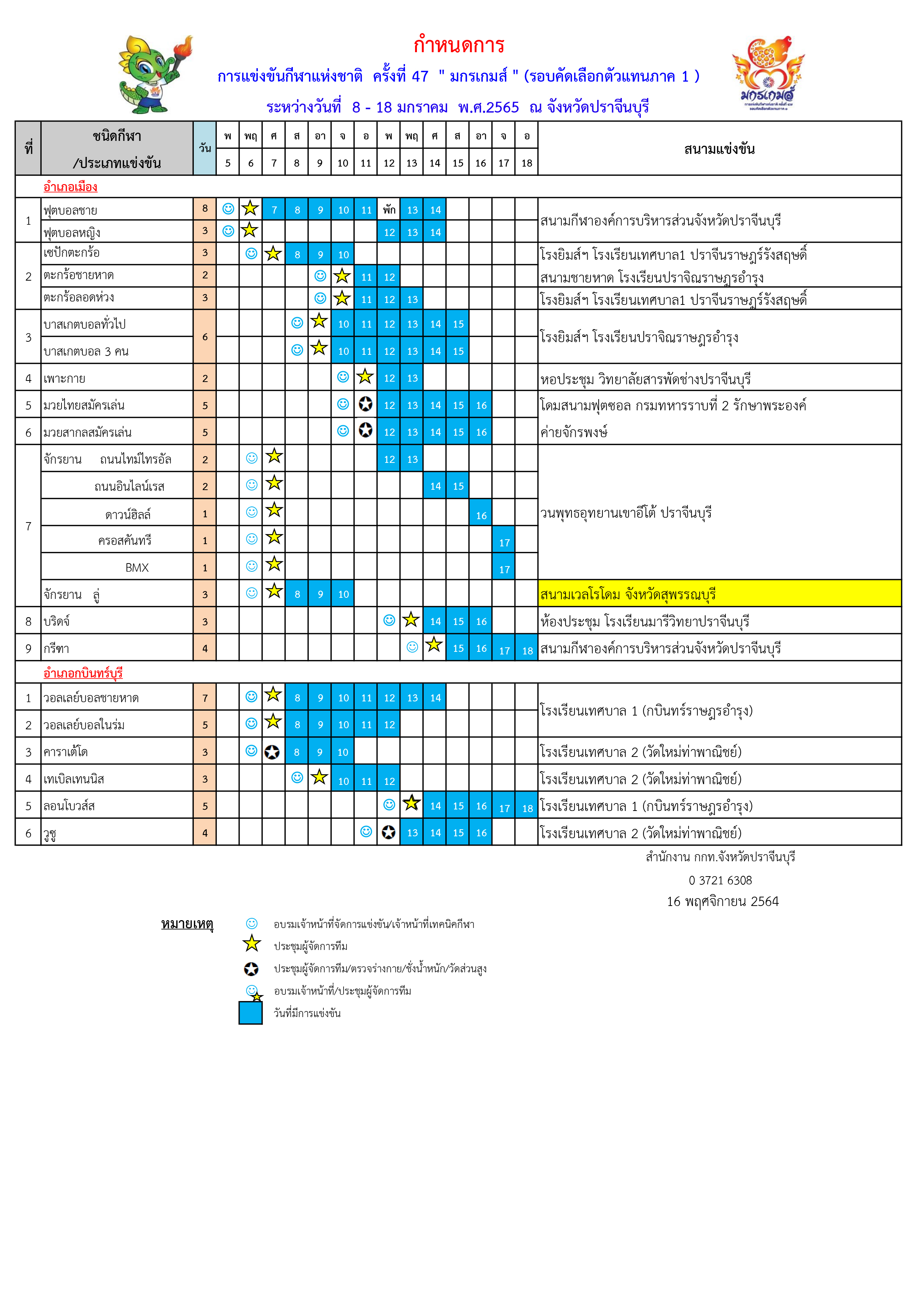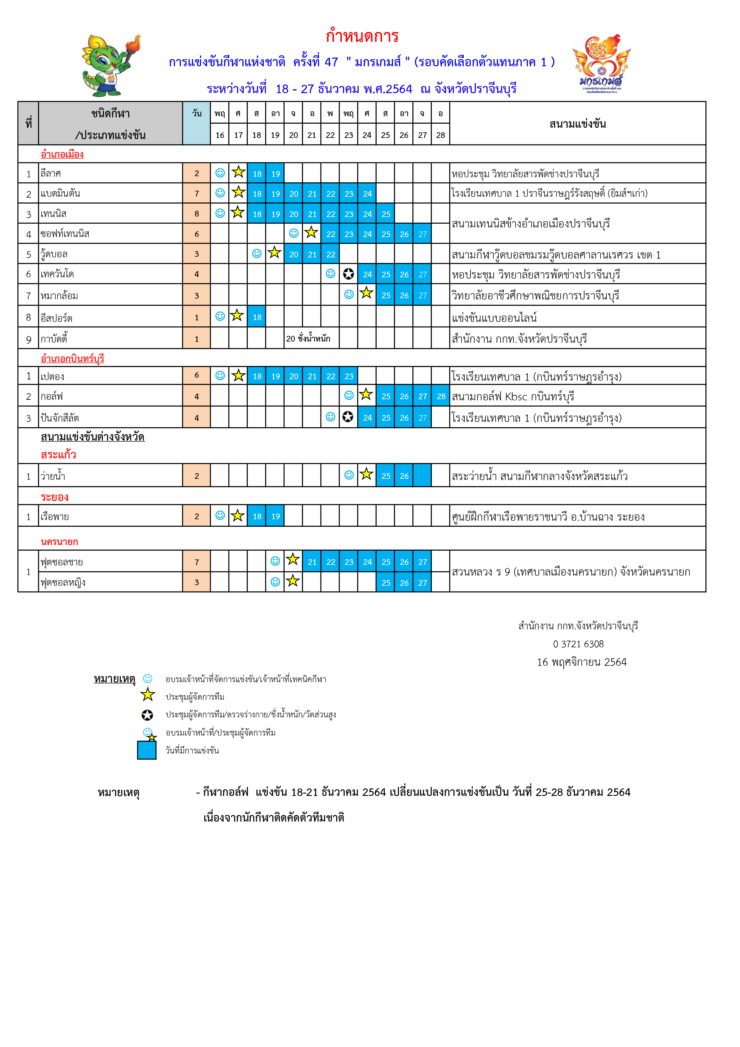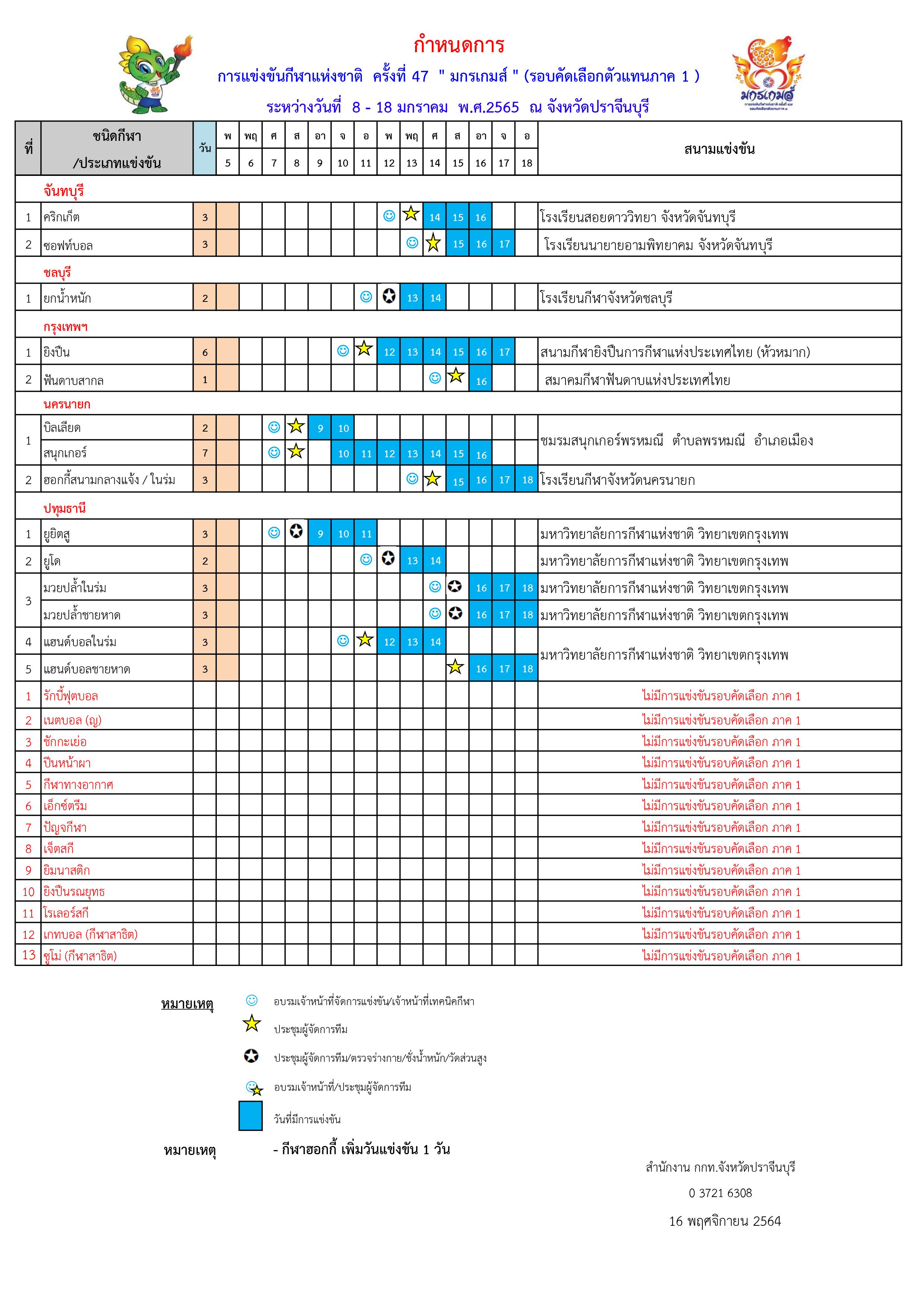 - รายชื่อคณะกรรมการ เจ้าหน้าที่และนักกีฬาตัวแทนจังหวัดชลบุรี เข้าร่วมการแข่งขันกีฬาแห่งชาติ ครั้งที่ 47 (รอบคัดเลือกตัวแทนภาค 1) “มกรเกมส์” ณ จังหวัดปราจีนบุรี