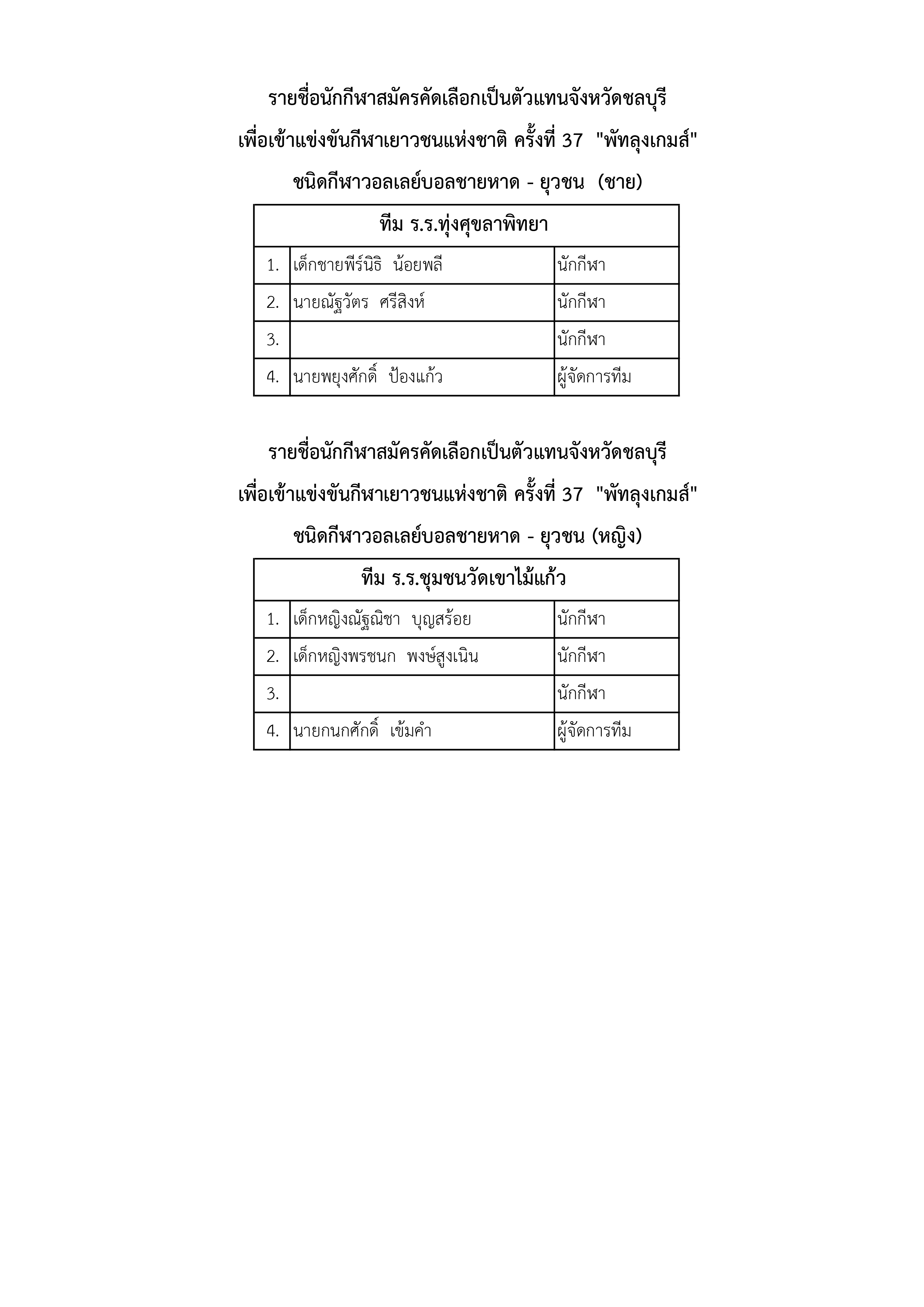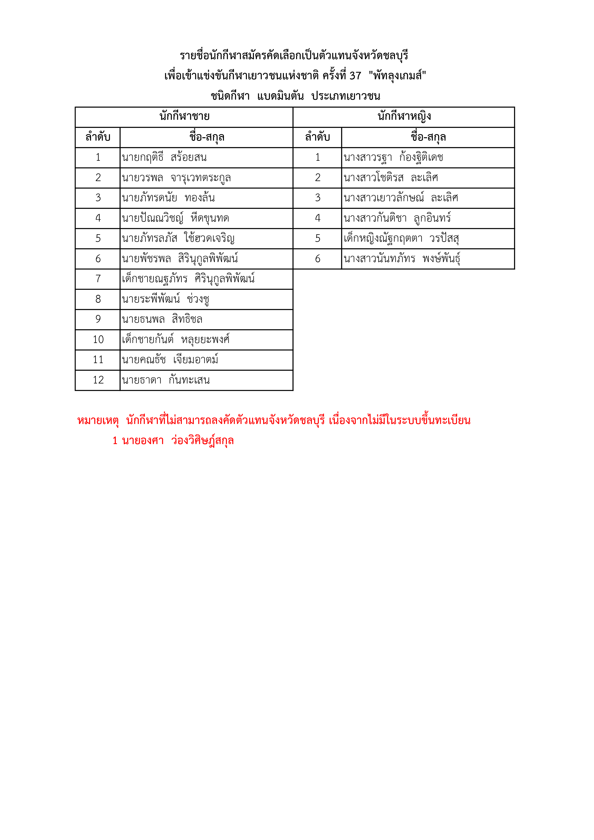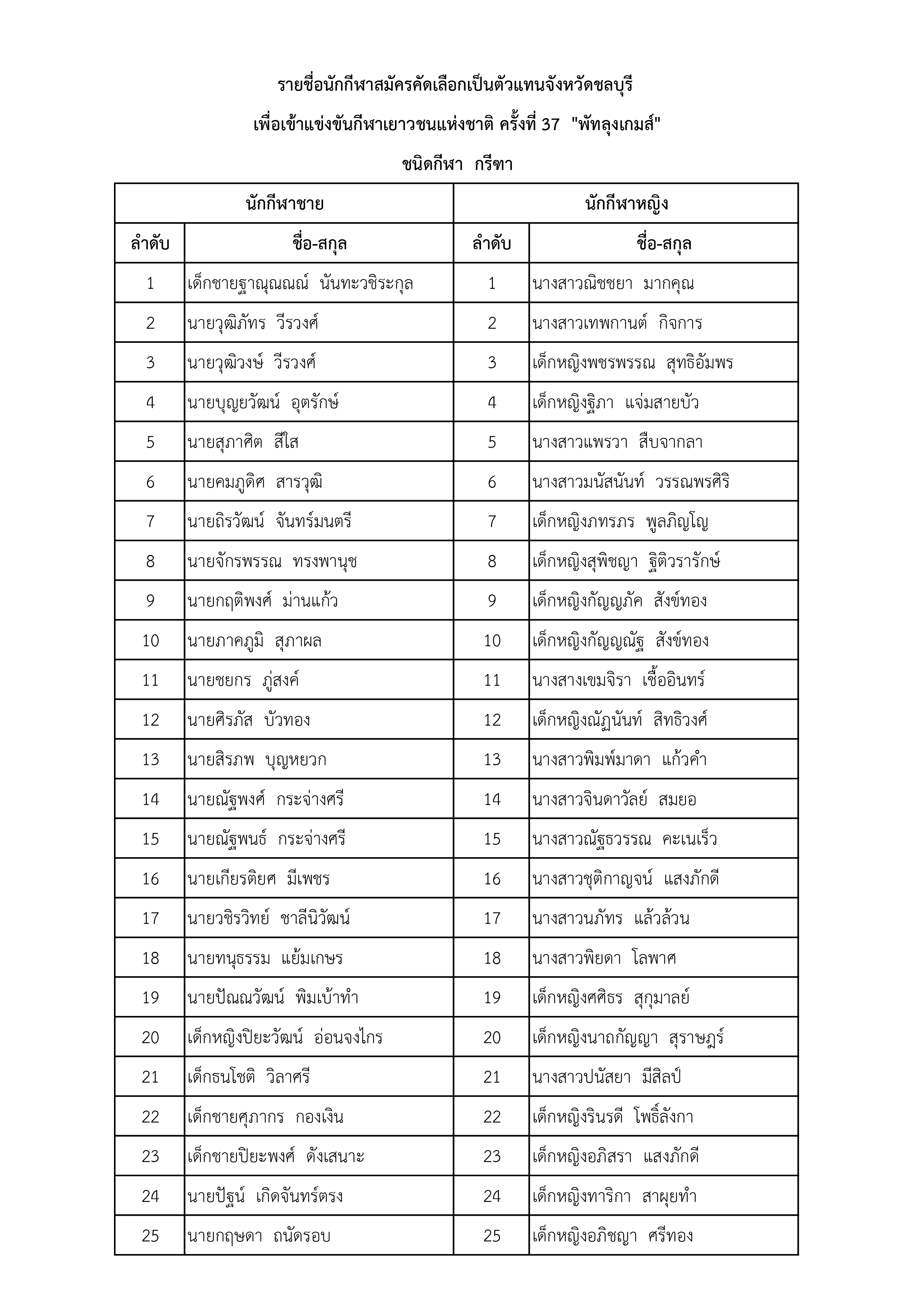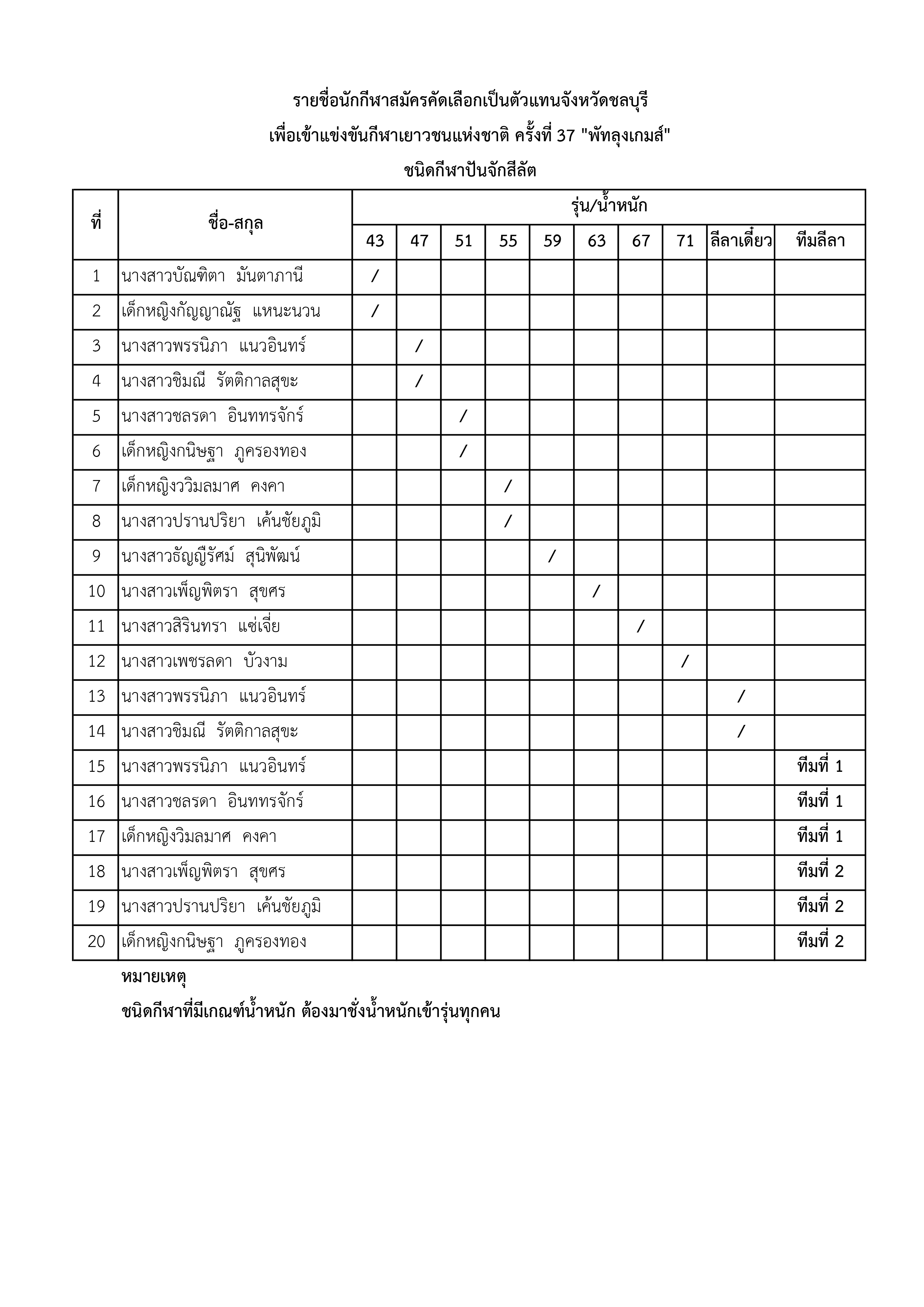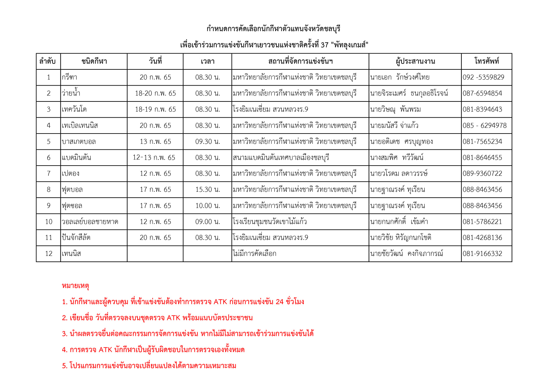 กำหนดการคัดเลือกนักกีฬาตัวแทนจังหวัดชลบุรี เพื่อเข้าแข่งขันกีฬาเยาวชนแห่งชาติ ครั้งที่ 37 "พัทลุงเกมส์" ระหว่างวันที่ 12-20 ก.พ. 65
