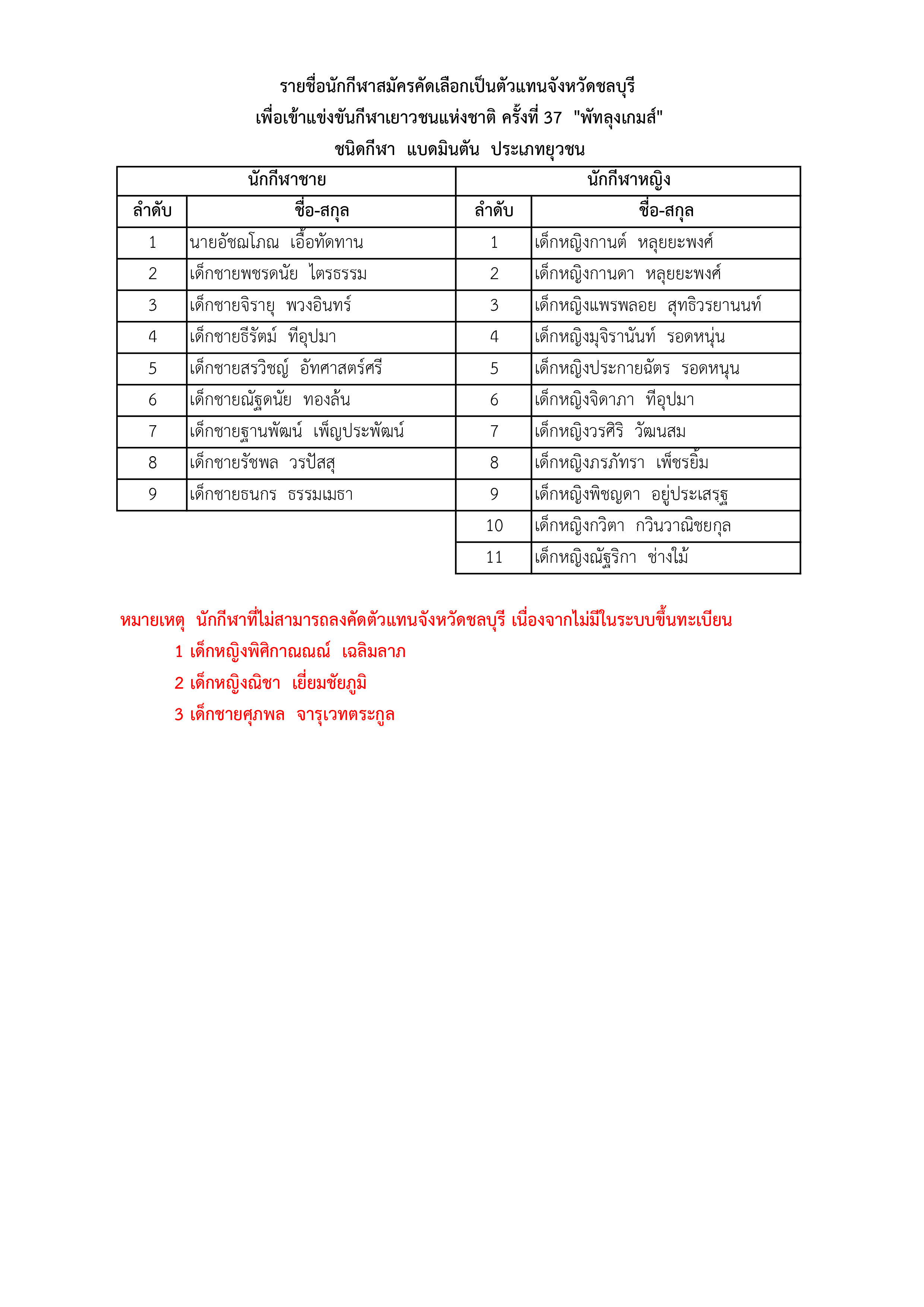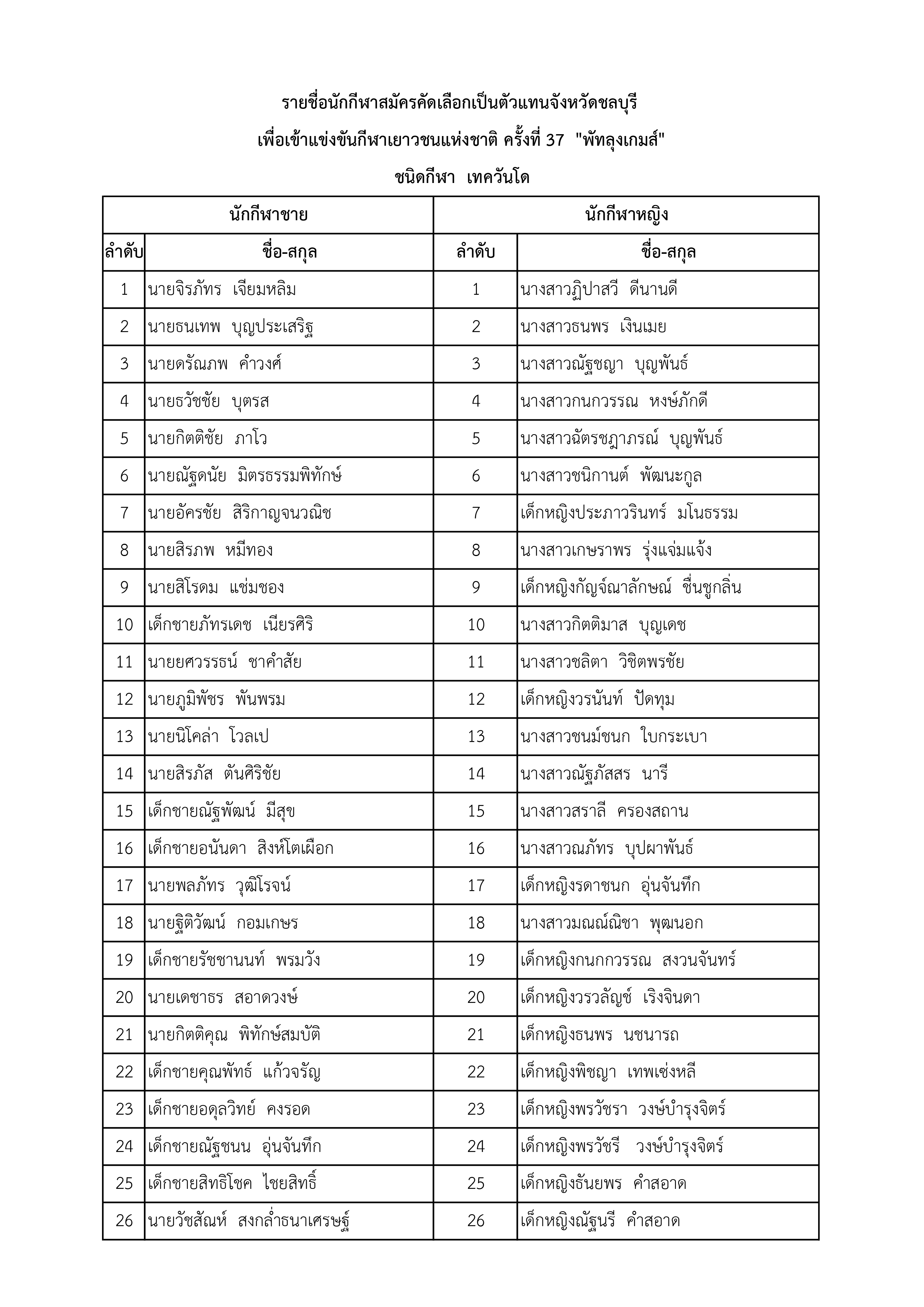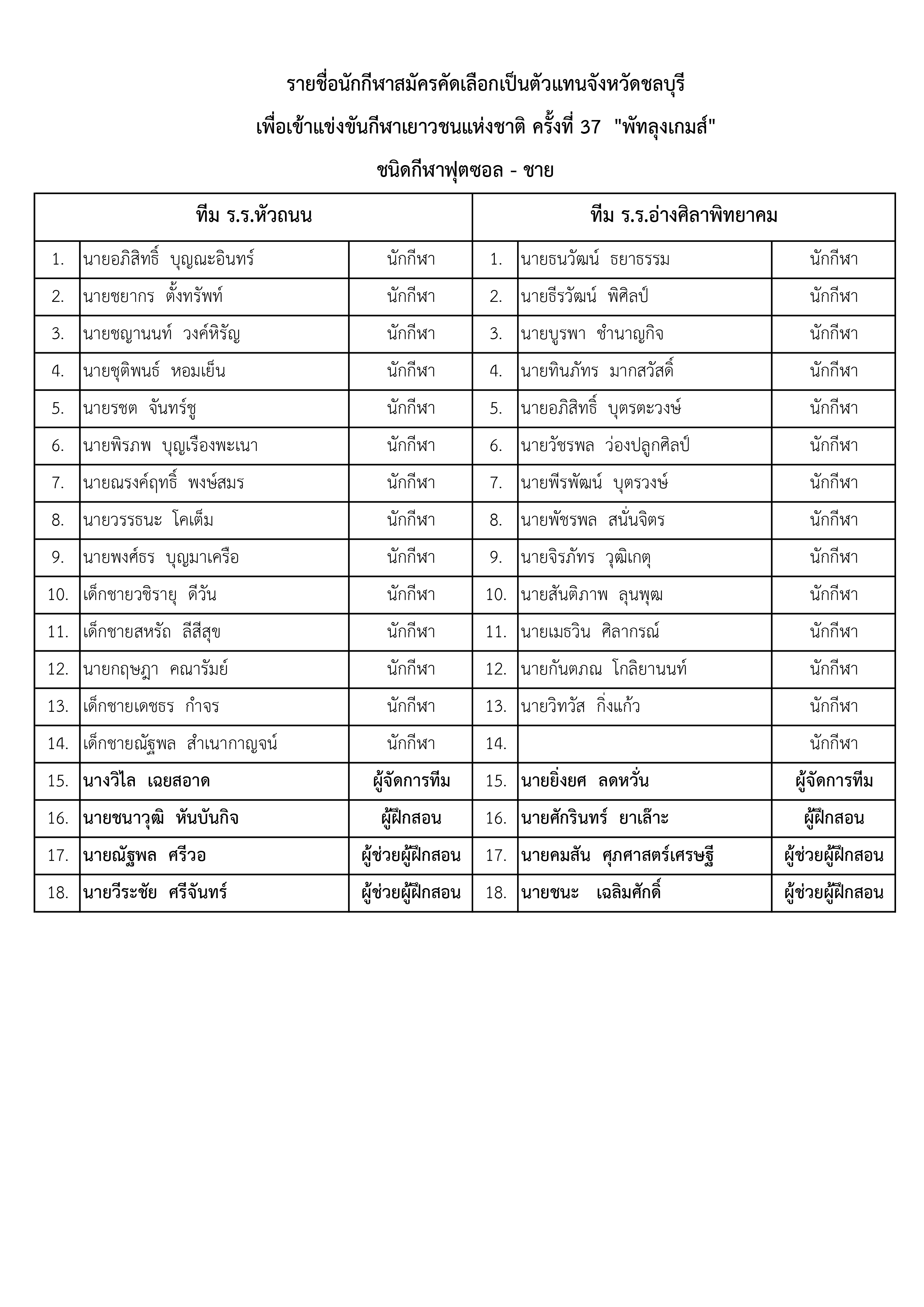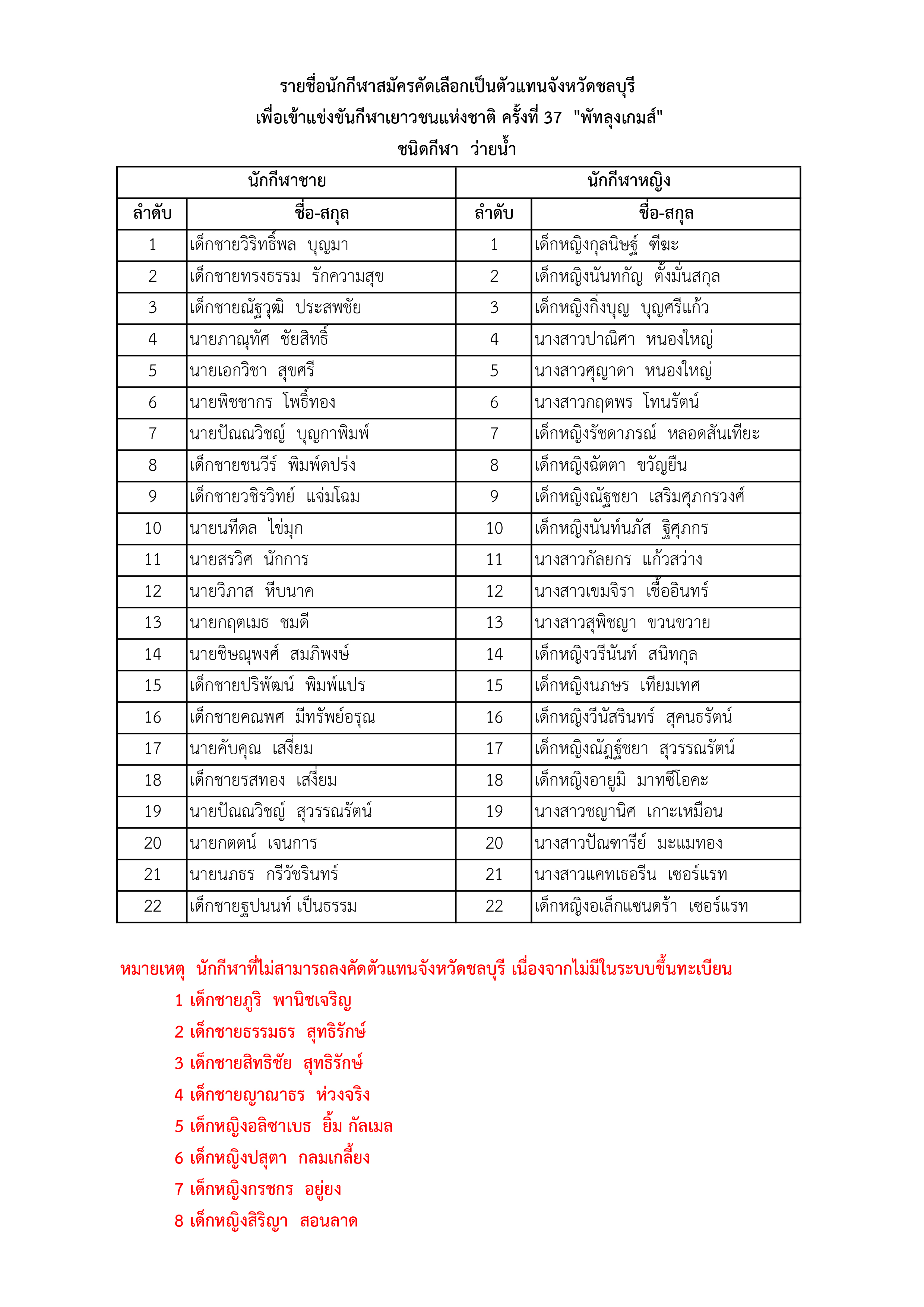 กำหนดการคัดเลือกนักกีฬาตัวแทนจังหวัดชลบุรี เพื่อเข้าแข่งขันกีฬาเยาวชนแห่งชาติ ครั้งที่ 37 "พัทลุงเกมส์" ระหว่างวันที่ 12-20 ก.พ. 65