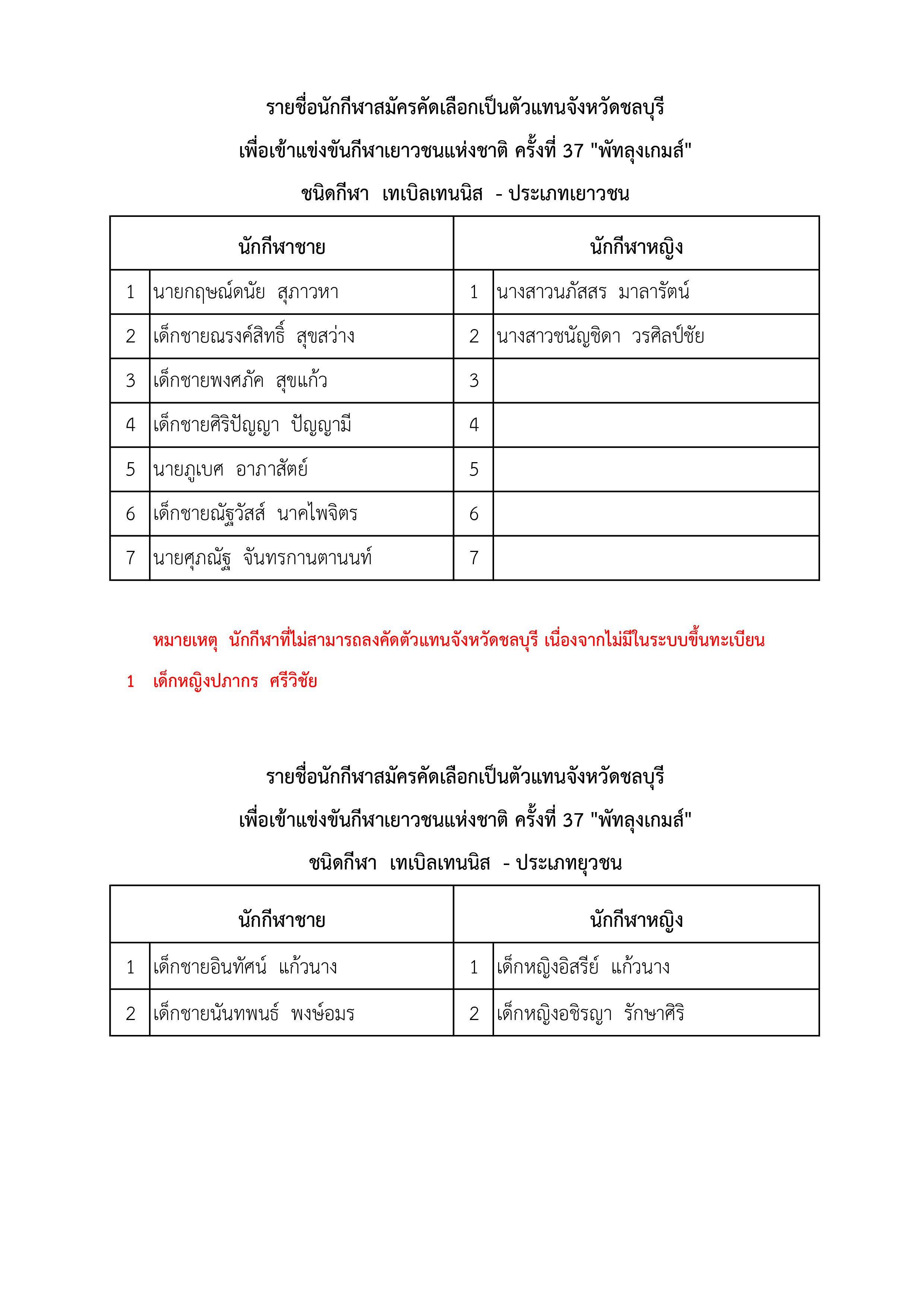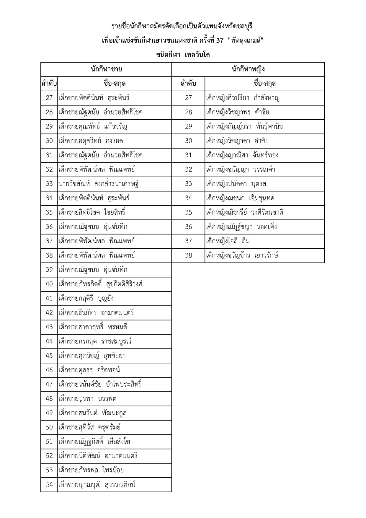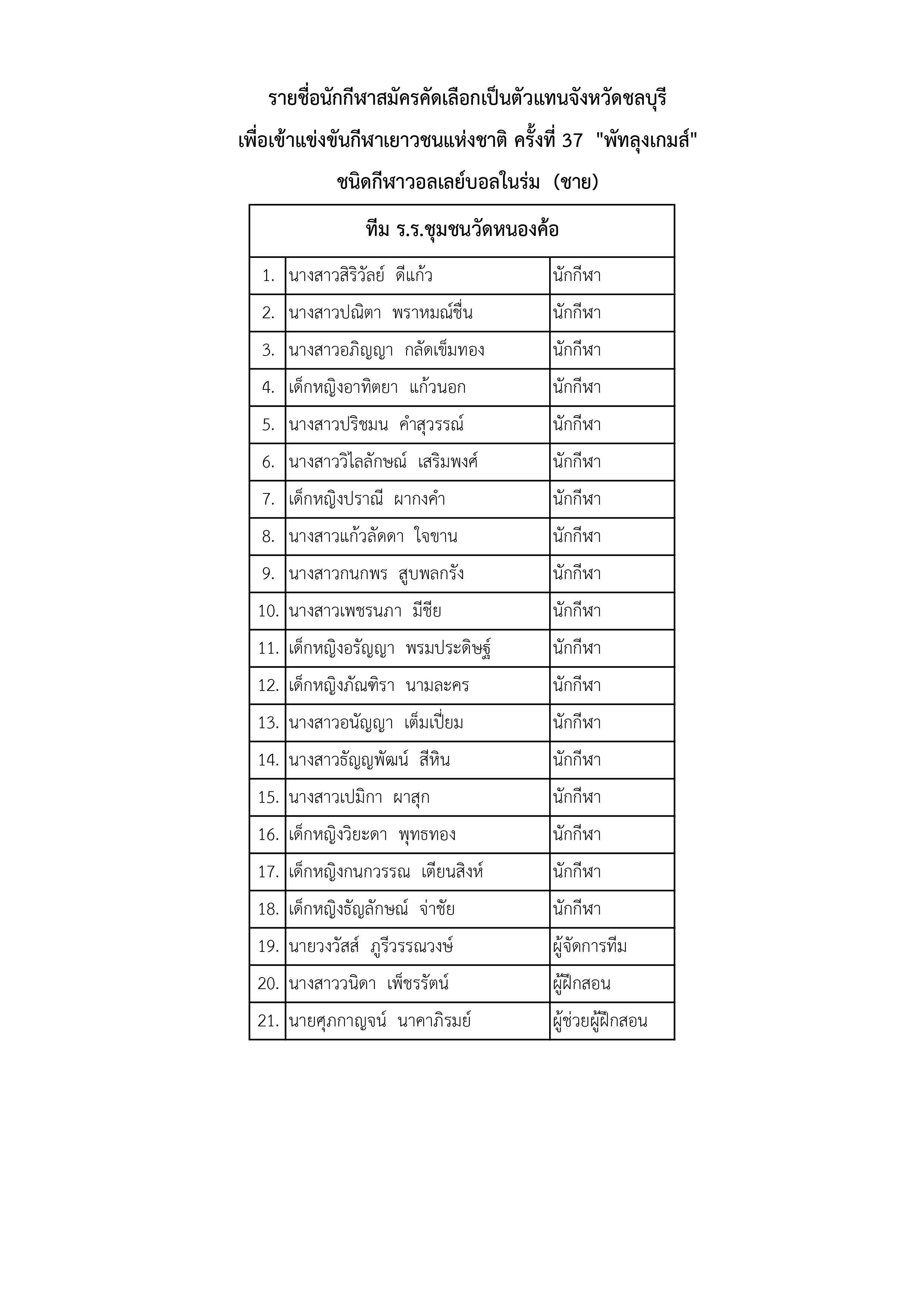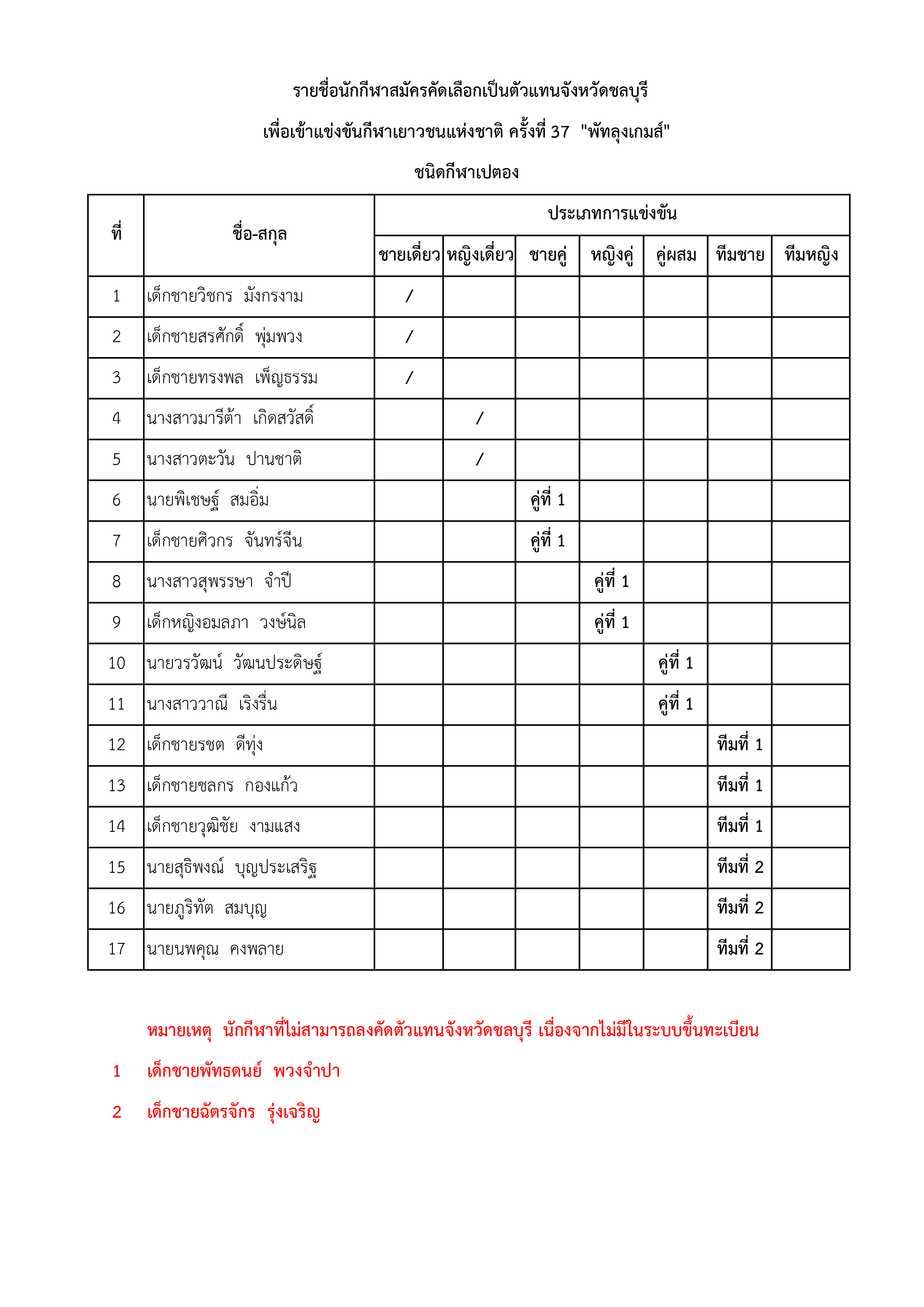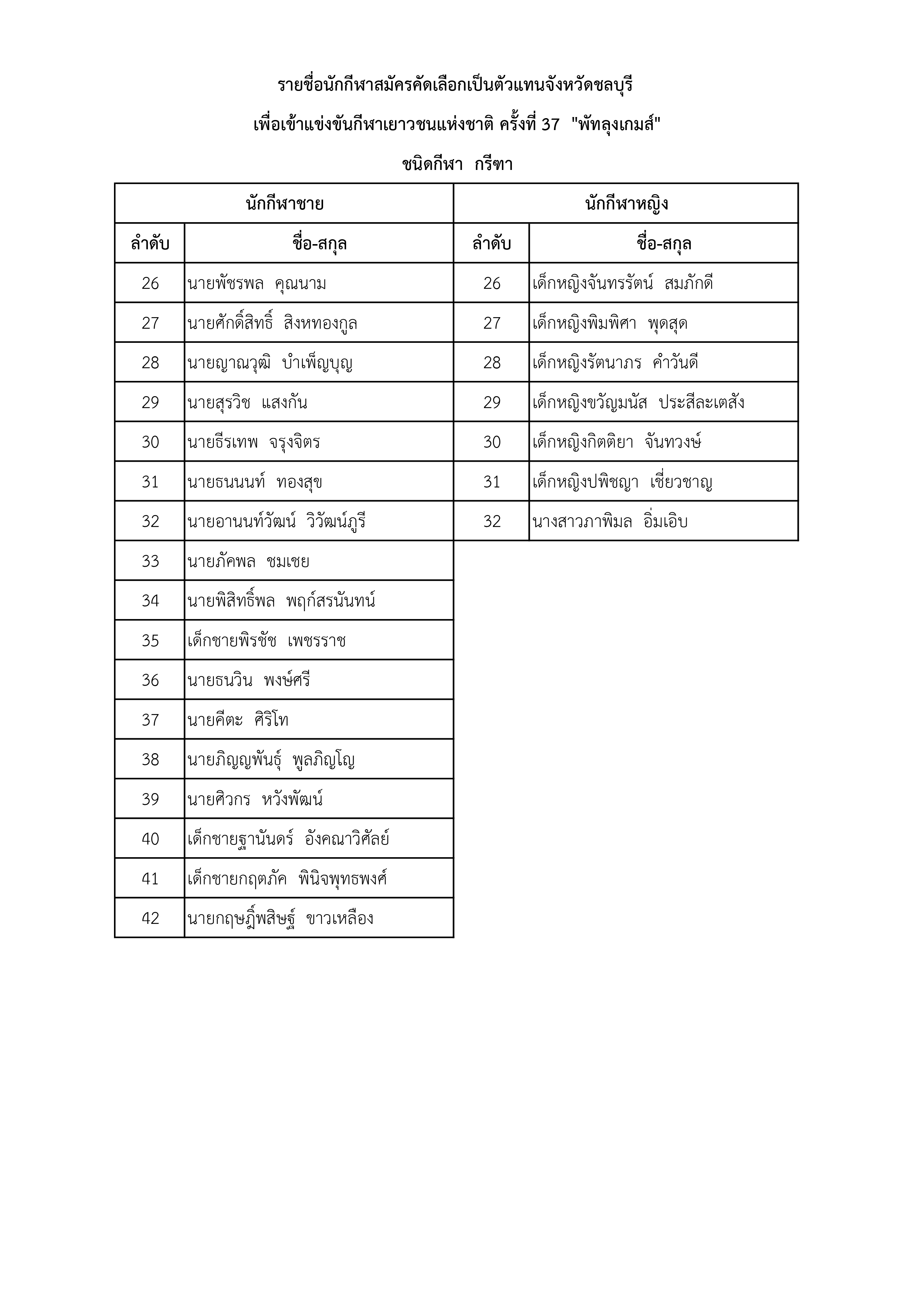กำหนดการคัดเลือกนักกีฬาตัวแทนจังหวัดชลบุรี เพื่อเข้าแข่งขันกีฬาเยาวชนแห่งชาติ ครั้งที่ 37 "พัทลุงเกมส์" ระหว่างวันที่ 12-20 ก.พ. 65